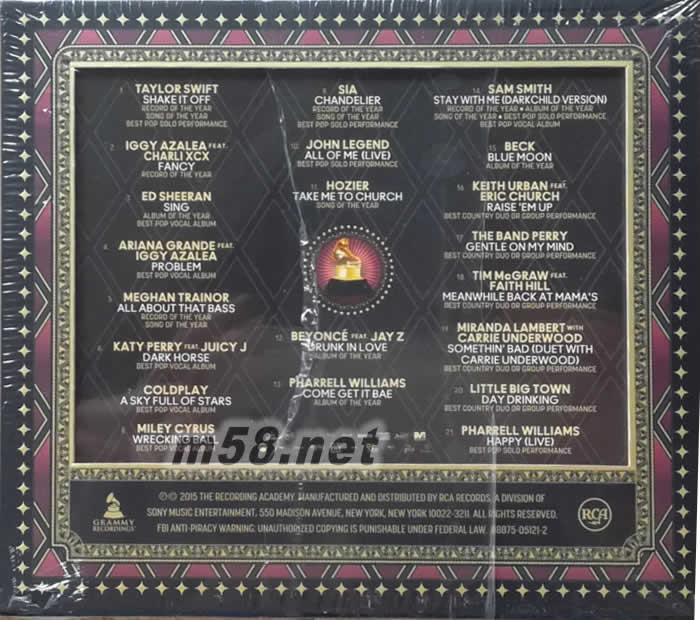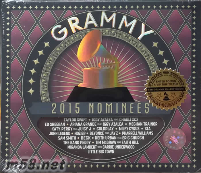 2015 葛萊美GRAMMY® Nominees(美版)(m58.net) 2015格林美官方大碟”2015 GRAMMY® Nominees”. 精彩輯錄21首大熱提名歌曲. 收錄歌手包括 Taylor Swift, Ed Sheeran, Ariana Grande, Meghan Trainor, Coldplay, Sia 及Pharrell. 全部都是去年樂壇最熱的名字, 曲目有史以來最強(qiáng), 歌迷不容錯過!