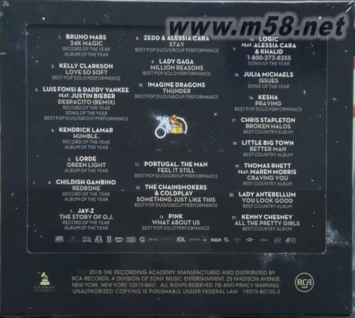 2018 Grammy Nominees 2018年葛萊美的喝彩(m58.net) ◎全球聚焦「年度唱片」、「年度專輯」、「年度歌曲」、「最佳流行歌手」、「最佳流行重唱/團體演出」、「最佳鄉村專輯」等第60屆葛萊美獎6項大獎入圍名單最重量級合輯,一年就等這一張 ◎一網打盡凱莎、杰斯、蘿兒、紅粉佳人、女神卡卡、謎幻樂團、凱莉克萊森、路易斯方辛、肯卓克拉瑪、火星人布魯諾、老菸槍雙人組等21組最強巨星頂尖對決,你才是葛萊美大贏家 ◎首批限量進口專屬鏤空燙金紀念紙盒 一年一度全美流行樂壇音樂盛事「葛萊美頒獎典禮」,同為國際西洋音樂指標,天王天后天團的鎂光燈聚焦,杰出后起新秀的實力展現,一再提供征服嚴苛樂評與樂迷的專輯和單曲佳作!萬眾矚目《2018葛萊美的喝采》最重量級合輯,精挑叱咤不同領域排行各榜、締造驚人串流量、數位銷售量等共21首提名曲目,一網打盡全年度流行精彩,絕對是每一位樂迷必備的朝圣大碟! --舞到天明大熱門-- 神曲製造機老菸槍雙人組&英倫酷玩樂團百聽不膩之〈Something Just Like This〉;路易斯方辛&洋基老爹和小賈斯汀蟬聯告示牌16週冠軍拉丁國歌〈Despacito〉;百大DJ捷德+加拿大快紅新聲代艾莉希亞爆紅之歌〈Stay〉;開啟靈性才女蘿兒全新舞風決定曲〈Green Light〉! --強勢回歸必聽曲-- 電音女皇凱莎浴火重生動容主打〈Praying〉;女力搖滾天后紅粉佳人寫下45國iTunes榜冠軍新曲〈What About Us〉;百變流行女神卡卡柔情告白〈Million Reasons〉;暢銷歌曲不停歇的火星人布魯諾延續復古歡樂歌〈24K Magic〉! --跨領域話題主打— 流行類:星光一姐凱莉克萊森轉換風格強打〈Love So Soft〉;搖滾類:快速崛起的謎幻樂團突破樂派驚人代表〈Thunder〉;嘻哈類:饒舌新生代救世主肯卓克拉瑪霸佔美國流行+節奏藍調/嘻哈+饒舌三榜冠軍〈HUMBLE.〉;鄉村類:千萬銷售鄉村天王肯尼薛士尼鄉村點播榜冠軍〈All The Pretty Girls〉! 內附原文歌詞