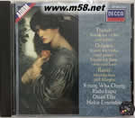Decca公司這款著名的室內樂唱片是由小提琴家鄭京和 (Kyung Wha Chung)與鋼琴家拉杜?魯普(Radu Lupu)合作灌錄的。 弗朗克的《A大調小提琴奏鳴曲》集中體現了他的創作特征:旋律氣質不凡,表現力深刻,和聲新穎,結構堅實協調。弗朗克于1886年完成這首《A大調小提琴奏鳴曲》,時年63歲,正處于創作的巔峰期。就像他其他作品一樣,這首奏鳴曲是循環式的,四個樂章的主題素材都源自單一的原始動機。第一章的開場小節引出這個動機,小提琴安詳地以琶音主奏主題,將鋼琴微妙的四小節冥想具體化。主題以詩歌般的長度來鋪陳,先是被抑制,然后抒情性逐漸加強。熱情的第二樂章與這種幻想的曲風形成強烈對比,十分激烈,雖然其中也有一些田園詩般慵懶的樂段。 鄭京和是韓國當代女小提琴大師,她9歲在漢城交響樂隊合作下演奏門德爾松的小提琴協奏曲,19歲獲美國勃文垂特國際比賽一等獎。1967年獲利文特里特國際小提琴競賽一等獎。1968年與紐約曼樂管弦樂團合作在紐約首次演出獲很大成功,后多次與歐美亞著名管弦樂團合作演出。1970年與普列文指揮的倫敦交響樂團合作演出柴可夫斯基小提琴協奏曲,大為轟動,從此確立了這位極富自發性的女小提琴家在20世紀后期國際樂壇的地位。其演奏有精確的節奏感和透明清純的音質,感情非常豐富,美妙的抒情味能滲入作品的深處。 羅馬尼亞鋼琴家拉杜?魯普6歲學琴,12歲登臺演奏,他的鋼琴老師穆濟切斯庫也是李帕蒂的老師,1963年獲獎學金到莫斯科音樂學院在涅高茲班上學習。1966年獲克萊本國際比賽獎,1967年獲埃乃斯庫比賽獎,1969年又獲利茲國際比賽獎。魯普的演奏追求音的微妙與流暢,在微妙的音中追求透明的陰影感;追求強音及它所造成的鮮明的明暗效果,強調動態與幅度。魯普演奏的舒伯特、勃拉姆斯及與戈爾德堡合作的莫扎特小提琴奏鳴曲最具特色。
