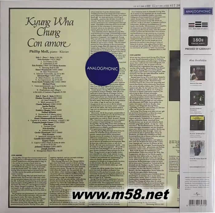 Con Amore小提琴抒情小品集 黑膠(m58.net) Kyung Wha Chung, violin Philip Moll, piano 1987年推出的這張演奏克萊斯勒、埃爾加、布拉姆斯等名家作品的精選集是她最受歡迎和好評的經典唱片。模擬聲音系列,180克高保真德國 Pallas 壓制!