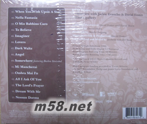 1. When You Wish Upon a Star Harline 2. Nella Fantasia Morricone 3. O Mio Babbino Caro Puccini 4. To Believe Evancho 5. Imaginer Afanasieff/Fabian 6. Lovers Umebayashi 7. Dark Waltz Morasca/Musker/Sagg 8. Angel Maclachlan 9. Somewhere Bernstein 10. Mi Mancherai Groban/Mouquet 11. Ombra Mai Fù Handel 12. All I Ask of You Lloyd Webber 13. The Lord's Prayer Malotte 14. Dream with Me Evancho/Foster/Thom 15. Nessun Dorma Puccini 16. [Untitled DVD Track] Unspecified