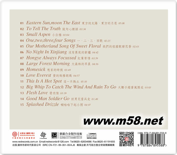 01.東方的太陽,東方的月亮 Eastern sun, moon of the East 02.說句心里話 To tell the truth 03.小白楊 Small aspen 04.一、二、三、四歌 One, two, three, four songs 05.我們得祖國歌甜花香 Our motherland song of sweet floral 06.沒有黑夜的新疆 No night in Xinjiang 07.紅葉寄情 Hongye always focussed 08、大森林的早晨 Large forest morning 09.想家的時候 Homesick 10.愛的珠穆朗瑪 Love Everest 11.這一片熱土 This is a hot spot 12.大鞭子趕著風雨走 Big whip to catch the wind and rain to go 13.骨肉情 Flesh love 14.好男兒當兵走 Good man soldier go 15.唰啦啦下起小雨 Splashed drizzle