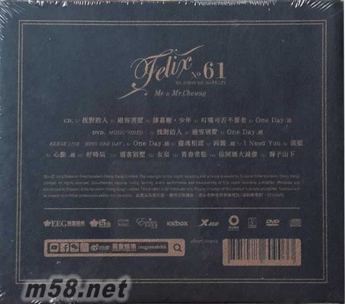 Felix NO 61(m58.net) 與墻共舞 伴燈傾訢 一張專輯 記錄張敬軒與舊居的情感 冠軍歌 : 過客別墅 / 找對的人 點題作品 : 緋荔榭•少年 特別收錄 : 叮噹可否不要老 / One Day DVD 收錄3首Music Video 及 “KKBOX Live : Hins One Day”音樂會