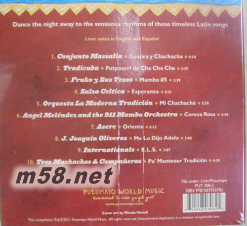 Putumayo Presents:rumba mambo cha cha cha 倫巴曼波恰恰恰 拉丁舞會 美版(m58.net) 在拉丁音樂的世界里有著非常豐富多樣的跳舞音樂,常常讓人眼花撩亂,這些聽起來好像都差不多的拉丁舞曲,彼此之間都有相似的共通性,像是大家熟悉的Salsa Dance(騷莎),就是將許多類似的拉丁舞曲全部融合在一起而成,Salsa有著Son(頌樂)的Call and Response(回應式唱法),Rumba的節奏、切分音及齊奏的地方取材自Mambo、又可以用來跳Cha-Cha-Cha,但是當這些音樂類型單獨存在時,還是能保有相當程度的差異及特色。Rumba/Mambo/Cha-Cha-Cha這三種音樂都源自於古巴,Rumba多是以吉他將固定節奏給彈出來,其他樂器來搭配,慢板聽來相當優雅,快板的則是熱情難擋;Mambo的速度就比較快一點,通常都以爵士樂隊編制進行表演,以銅管樂器擔任主奏及伴奏;而Cha-Cha-Cha則是Mambo的變種,速度較慢,強調的是打擊樂器的使用,每一拍都有相當清楚而分明的敲擊聲。 近幾年,這三種不同的音樂也逐漸走在了一起,不容易區分誰是誰,嚴然成為繼Salsa之后另一個拉丁通用音樂,本輯收錄的就是當代最具代表的藝人團體在這三種融合音樂上的頂尖作品,Cha-Cha-Cha的部份包括了來自拉丁大本營古巴的三組團體Tradicuba演唱的” Potpourri De Cha Cha Cha”(這首歌小野麗莎也唱過)、Orquesta la Moderna Tradicion及J. Joaquin Oliveros,來自法國馬賽的國際知名樂隊Conjunto Massalia;Mambo的部份當然少不了Mambo的國歌”Mambo #5”,負責演出的是來自哥倫比亞的首席樂隊Fruko & Sus Tesos,還有葛來美獎得主Angel Melendez And The 911 Mambo Orchestra也貢獻一曲經典作” Cereza Rosa”,還有來自比利時的Internationals;Rumba的部份則請到了古巴的Asere及俄羅斯的Tres Muchachos & Companeros。如此豐富熱鬧的專輯,就像開了一場拉丁舞會般精彩。