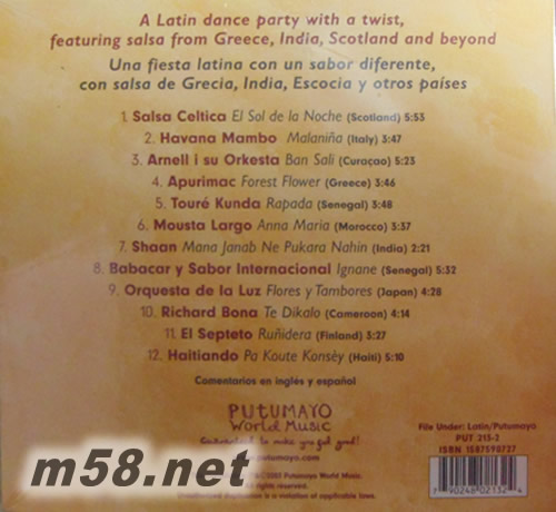 1. Salsa Celtica/ El Sol de la Noche (Scotland) 蘇格蘭多人樂團(tuán)巧妙融合克爾特風(fēng)笛的精彩之作 2. Havana Mambo/ Malanina (Italy) 威震全歐的義大利首席八人拉丁大團(tuán)排行勁曲 3. Arnell I su Orkesta/ Ban Sali (Curocao) 加勒比海庫拉島四人組暢快熱情之選 4. Apurimac/ Forest Flower (Greece) 希臘知名拉丁開路先鋒團(tuán)以希臘語唱出地中海的陽光 5. Toure Kunda/ Rapada (Senegal) 塞內(nèi)加爾兄弟二人組大玩熱鬧非洲打擊樂 6. Mousta Largo/ Anna Maria (Morocco) 摩洛哥才子融合Flamenco+Salsa的熱情快板舞曲 7. Shaan/ Mana Janab Ne Pukara Nahin (India) 印度歌舞樂與Salsa的驚人合體作 8. Babacar y Sabor Internacional/ Ignane (Senegal) 塞內(nèi)加爾最佳非洲古巴藝人加入非洲傳統(tǒng)樂器之作 9. Orquesta de la Luz/ Flores y Tambores (Japan) 日本超人氣拉丁巨團(tuán)散射無盡熱情活力 10. Richard Bona/ Te Dikalo (Cameroon) 喀麥隆旅美拉丁高手快板Salsa代表 11. El Septeto/ Runidera (Finland) 芬蘭拉丁樂先驅(qū)浪漫的慢板Salsa最佳示范 12. Haitiando/ Pa Koute Konsey (Haiti) 海地樂隊(duì)延伸古巴節(jié)奏活力熱情難擋