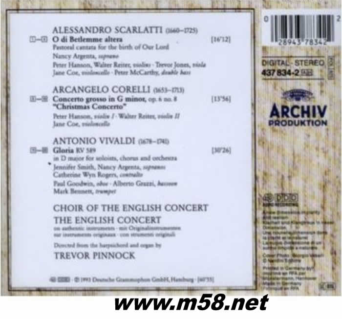 維瓦爾第:榮耀經Vivaldi: Gloria(m58.net) 這套《維瓦爾第:榮耀經》由Archive唱片公司發行于1993年,特雷沃•平諾克指揮英國協奏團及合唱團演奏錄制,內收錄了維瓦爾第的《榮耀經》、科雷利的《大協奏曲》等。 維瓦爾第的聲樂作品到20世紀才廣為人知,其教會音樂也是在1920年代后半才被發現約60首,《榮耀經》正是其中的一首曲子,1939年在Siena舉行的維瓦爾第音樂節中,《榮耀經》與其它一些埋沒的樂曲同時被復蘇首演,引起眾人矚目,許多音樂學學者認為有些曲子甚至可以媲美巴赫的宗教曲。《榮耀經》是巴洛克聲樂作品的代表,它有著宗教作品的莊重虔誠和悲天憫人的情懷,有著歌劇一般豐富多彩的歌唱技巧,也有著巴洛克音樂的復雜精致炫目中的平衡,支撐著一切的,正是對于生活的樂觀,對于信仰的執著,和對于被拯救的充分信心。 維瓦爾第共有兩首D大調《榮耀經》傳世,其中以RV.589較有名。這部《榮耀經》開頭的弦樂齊奏便現出標準的維瓦爾第式大跳,而后面接踵而來合唱和女聲二重唱,傾吐出婉轉的氣息,充溢著洋洋灑灑的溫柔悲憫。當然,這類作品大多也是這種氣質,可是其中的神來之筆卻是承天意所稟,那種“不朽”簡直有宿命的意味。其中的女高音詠嘆調,歌詞簡練,那旋律自然難以描繪,像是指向月亮的修長手指,被月光照得通體透明。然后氣氛接著被合唱點燃,依然是懇求憐憫和寬恕的神態,然而那歌聲輕盈自若,像是同那渴望一同飛升。據說巴赫的B小調彌撒即受這部作品影響。 英國本土古樂指揮大師特雷沃•平諾克(Trevor Pinnock)與他親手創立的英國協奏團所演繹的巴洛克作品在專業評論界是擁有極高評價的。平諾克對古樂深厚的研究以及英國協奏團清澈、明快的音色,在唱片中顯露無遺。特雷沃•平諾克的演繹既具有德國式的嚴謹,又具有英國式的清新和優雅。作為深受60、70年代風行歐洲的古樂運動影響的一員,平諾克在組建英國合奏團之初就確立了仿古樂器在樂團中的主導地位。除了使用仿古樂器,他們還盡可能使用古代的演奏方式,追求一種真實而質樸的演奏效果。他曾經說過這樣的話:“歷史是有趣的,但在舞臺上歷史幾乎沒有它的一席之地,而對于我們音樂家而言,古樂器已經超越了歷史而成為音樂表情的有機成分。” 英國協奏樂團為英國最優秀的室內樂樂團之一,1973年由平諾克和斯坦奇等人創建。樂團偏重于巴洛克時期的音樂,追求“原本”的真實和演奏風格的純正。他們認真地研究和考證樂譜和各種文獻,在維多利亞和阿爾伯特博物館的支持下,利用館藏多年的古樂器來演奏,力求獲得和展現巴洛克時期音樂的精髓和原始風貌。20多年來,這支古樂團從小到大、不斷發展,除每年定期到歐美及亞洲等地舉行音樂會外, 還經常在許多世界著名的音樂節上登臺,像雪斯維格—霍斯坦音樂節、圣西西里亞音樂節、愛丁堡音樂節等。1988年,英國協奏樂團在薩爾茨堡音樂節上演出亨德爾的《彌賽亞》,受到好評。此后,便成為該音樂節的常客。