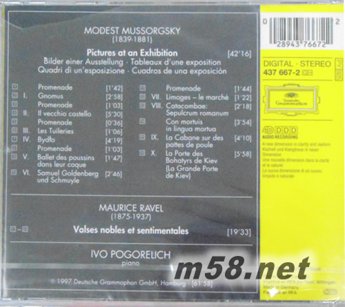 穆索斯基:展覽會(huì)之畫(鋼琴版)&拉威爾:高雅而憂傷的圓舞曲Mussorgsky:Pictures At An Exhibition &Ravel:Valses Nobles Et(m58.net) 穆索斯基:展覽會(huì)之畫 ; 拉威爾:高貴與憂傷的圓舞曲 / 波哥雷里奇 (鋼琴) Mussorgsky: Pictures at an Exhibition ; Ravel: Valses nobles et sentimentales / Ivo Pogorelich 作曲家:穆索斯基 演出者:波哥雷里奇