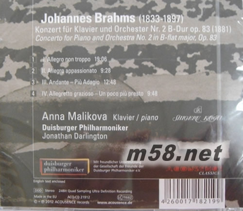BRAHMS: CONCERTO FOR PIANO AND ORCHESTRA NO.2 IN B-FLAT MAJOR, OP.83 (布拉姆斯降協(xié))(m58.net) ACOUSENCE records (原音天碟)… the acoustic experience錄音理念以發(fā)燒音效配上感動(dòng)聽眾之樂章,帶出現(xiàn)場(chǎng)感,重播現(xiàn)場(chǎng)原音為目標(biāo)。 LIVING CONCERT SERIES (現(xiàn)場(chǎng)一樣系列)最新作品,Jonathan Darlington (喬納森。達(dá)林頓)指揮Duisburger Philharmoniker (德國(guó)杜伊斯堡愛樂樂團(tuán))精彩演出,Anna Malikova (安娜。馬利科娃)是國(guó)際著名鋼琴家,打從1991年畢業(yè)于柴可夫斯基音樂學(xué)校,往后多年,她參加過四次國(guó)際鋼琴比賽,但每次都是獲獎(jiǎng),她熱愛舞臺(tái)表演,因此推出市場(chǎng)之專輯為數(shù)不多,約為十多張,值得擁有。
