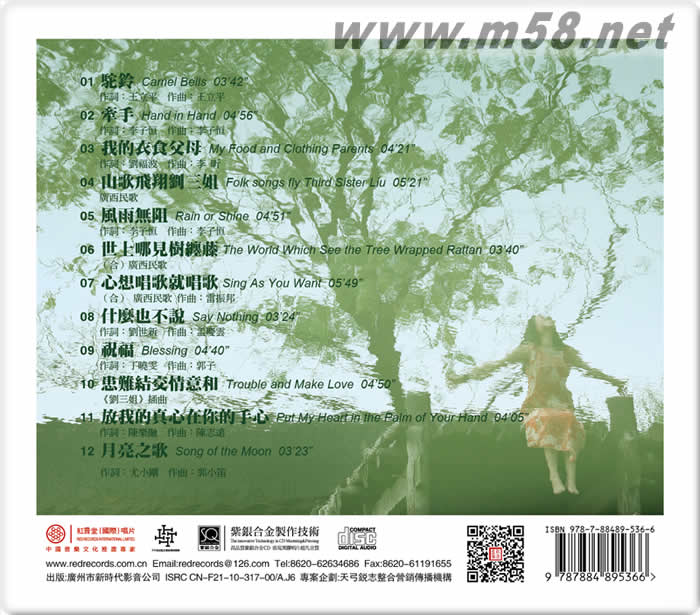 01 駝鈴 Camel Bells 03’42” 作詞:王立平 作曲:王立平 02 牽手 Hand in Hand 04’56” 作詞:李子恒 作曲:李子恒 03 我的衣食父母 My Food and Clothing Parents 04’21” 作詞:劉福波 作曲:李 昕 04 山歌飛翔劉三姐 Folk songs fly Third Sister Liu 05’21” 廣西民歌 05 風雨無阻 Rain or Shine 04’51” 作詞:李子恒 作曲:李子恒 06 世上哪見樹纏藤 The World Which See the Tree Wrapped Rattan 03’40” (合)廣西民歌 07 心想唱歌就唱歌 Sing As You Want 05’49” (合) 廣西民歌 作曲:雷振邦 08 什么也不說 Say Nothing 03’24” 作詞:劉世新 作曲:孟慶云 09 祝福 Blessing 04’40” 作詞:丁曉雯 作曲:郭子 10 患難結(jié)交情意和 Trouble and Make Love 04’50” 《劉三姐》插曲 11 放我的真心在你的手心 Put My Heart in the Palm of Your Hand 04’05” 作詞:陳樂融 作曲:陳志遠 12 月亮之歌 Song of the Moon 03’23” 作詞:尤小剛 作曲:郭小笛