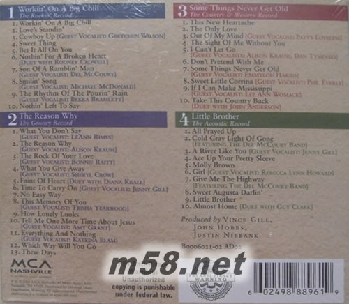 These Days 套裝美版(m58.net) 第三十五屆格萊美(1993)最佳鄉(xiāng)村男藝人 vince gill(文斯·基爾),1957年4月12日出生于美國奧克拉荷馬州的諾曼(Norman),原名文斯·格蘭特·基爾(Vince Grant Gill)。他的父親是一名聯(lián)邦法官,會彈班卓琴。基爾10歲開始學習吉他,上中學時就參加過當?shù)匾恢Ы?山霧"(Mountain Smoke)的鄉(xiāng)村搖滾樂隊。中學畢業(yè)后,他得到高爾夫運動員獎學金,到肯德基州的路易斯維爾(Louisville)上大學,很快便參加了一支叫"南方聯(lián)盟"的樂隊。此時他除了會彈奏吉他外,還會演奏曼陀林、小提琴和班卓琴。1979年,基爾來到納什維爾并很快的成了音樂節(jié)上的紅人。1984年,他的歌曲第一次進入鄉(xiāng)村歌曲排行榜前40 名。此后,他的歌曲不斷地在排行榜上取得佳績。 進入90 年代,基爾留下了輝煌的足跡,除了錄制唱片外,他還是音樂會上的十大明星之一,兩次獲得鄉(xiāng)村音樂協(xié)會的最佳藝人獎。他說:"我希望有人記住我,我曾經(jīng)關(guān)心過鄉(xiāng)村音樂的完整性。我也喜歡當演員、當作曲家、做事業(yè)。同樣,我關(guān)心歷史,它從什么地方開始,他往哪兒發(fā)展。" vince gil的演唱娓娓道來,讓人觸動內(nèi)心心弦,值得用心去揣摩,去細細聆聽.