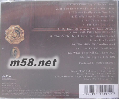 The Key 美版(m58.net) 第三十五屆格萊美(1993)最佳鄉村男藝人 vince gill(文斯·基爾),1957年4月12日出生于美國奧克拉荷馬州的諾曼(Norman),原名文斯·格蘭特·基爾(Vince Grant Gill)。他的父親是一名聯邦法官,會彈班卓琴。基爾10歲開始學習吉他,上中學時就參加過當地一支叫"山霧"(Mountain Smoke)的鄉村搖滾樂隊。中學畢業后,他得到高爾夫運動員獎學金,到肯德基州的路易斯維爾(Louisville)上大學,很快便參加了一支叫"南方聯盟"的樂隊。此時他除了會彈奏吉他外,還會演奏曼陀林、小提琴和班卓琴。1979年,基爾來到納什維爾并很快的成了音樂節上的紅人。1984年,他的歌曲第一次進入鄉村歌曲排行榜前40 名。此后,他的歌曲不斷地在排行榜上取得佳績。 進入90 年代,基爾留下了輝煌的足跡,除了錄制唱片外,他還是音樂會上的十大明星之一,兩次獲得鄉村音樂協會的最佳藝人獎。他說:"我希望有人記住我,我曾經關心過鄉村音樂的完整性。我也喜歡當演員、當作曲家、做事業。同樣,我關心歷史,它從什么地方開始,他往哪兒發展。" vince gil的演唱娓娓道來,讓人觸動內心心弦,值得用心去揣摩,去細細聆聽.