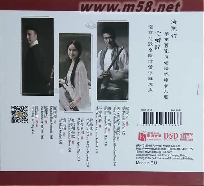 虞美人琴歌 (優雅動聽的古詩詞吟唱)德國版(m58.net) 吟唱:哈輝 琴:趙曉霞 笛簫:喻曉慶 鼓:王佳男 優雅動聽的古詩詞吟唱 歌聲綿長琴聲回味,唱吟唐詩宋詞文墨風流。即興創作,靈感迸發。完全同期大棚錄制彰顯中國古典氣質。制作人葉云川攜手四位古典音樂家,獻上詩意感動。錄音大師李大康功力非凡,親力錄制。讓琴歌里的山聲水音直潤心間。瑞鳴音樂精心呈現,中國古典琴歌的清雅之作。