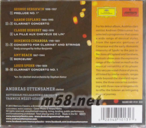 Portraits Clarinet Album 單簧管的肖像(m58.net) 安卓斯 歐騰薩瑪 2011年成為柏林愛樂管弦樂團首席單簧管樂手 安德烈˙奧登薩默,單簧管/亞尼克˙聶澤─賽金指揮鹿特丹愛樂 ★柏林愛樂單簧管首席,傲視歐陸最佳單簧管代言者 2011年三月,年僅二十二歲的奧地利單簧管演奏家奧登薩默坐上了柏林愛樂單簧管首席的位置。在此之前,他是柏林德意志交響樂團的單簧管首席! 奧登薩默1989年出生於維也納,四歲開始學習鋼琴,十歲進入國立維也納音樂暨表演藝術大學學習大提琴,十四歲開始學習單簧管。在學期間,奧登薩默曾經參與維也納愛樂與維也納國立歌劇院的樂團協演,並且加入馬勒青年管弦樂團。 奧登薩默以他美麗的音色以及獨特的音樂性得到樂評人的稱讚。德國《每日鏡報》形容他的音樂動態「似乎沒有界限……他的演奏千變萬化而且不斷擴展其表現力」。2013年年初,奧登薩默成為DG旗下第一名專屬單簧管演奏家,並且推出這張包括柯普蘭、史博、祈馬羅沙作品,以及數首改編小品的第一張個人專輯。由於專輯的曲目風格差異極大,因此,這對於奧登薩默對於不同風格音樂的掌握能力與演奏方式是一大挑戰。奧登薩默在表現不同風格之余,位然維持著高度的個人特色。由於曾經學過大提琴,因此,奧登薩默比起其他單簧管演奏家,更能靈活運用單簧管音色中的深沉與溫暖面。