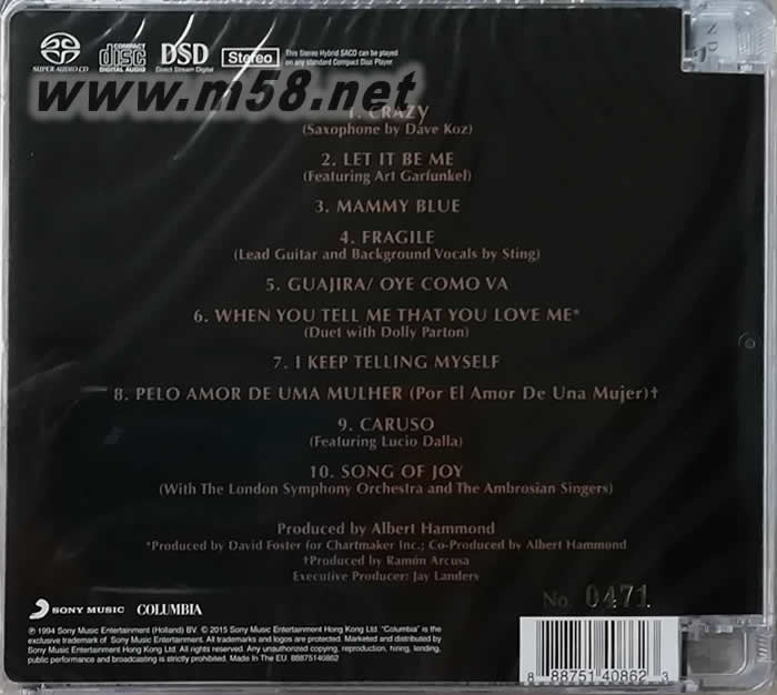 1. Crazy - Dave Koz 2. Let It Be Me - Art Garfunkel 3. Mammy Blue 4. Fragile - Sting 5. Guajira/Oye Como Va 6. When You Tell Me That You Love Me - Dolly Parton 7. I Keep Telling Myself 8. Pelo Amor de Uma Mulher (Por el Amor de Una Mujer) 9. Caruso 10. Song of Joy
