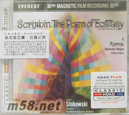 SCRIABIN / Le Poeme d'Extase 斯克里亞寶:狂喜之詩(m58.net) What is a 24/96 DVD & 24/192 DVD-A? It is a High Quality 24/96 DVD & 24/192 DVD-A Hybrid Digital Audio Disc (HDAD) (Audio-ONLY DVD!) which features both 24-bit/96kHz and 24-bit/192kHz digital sampling rates. This disc is a two sided DVD based disc. One side of the disc is DVD video formatted and contains 24/96 PCM data playable on all DVD video players. The other side contains 24/192 PCM data and is playable on DVD audio players.
