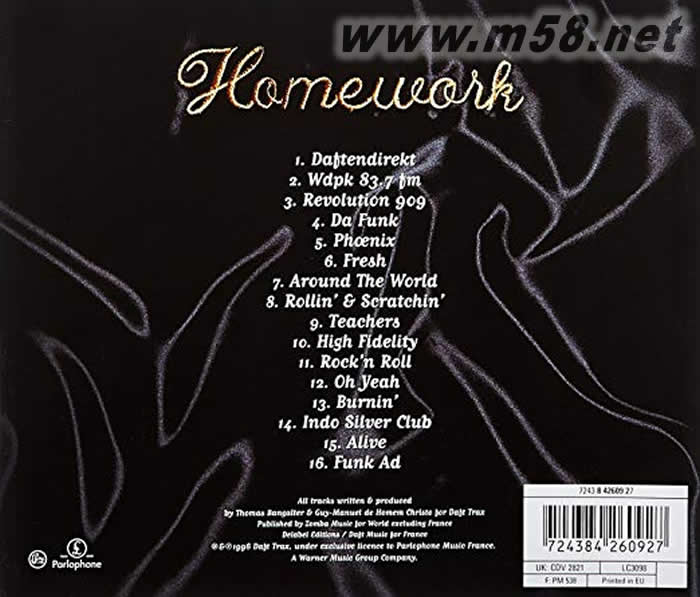 價格為估,以實到貨為準! Homework(m58.net) 傻朋克(英語:Daft Punk)是一個創立于法國巴黎的電子音樂團體,由蓋-馬努爾·德霍曼-克里斯托和湯瑪斯·本高特兩位唱片騎師于1992年組成 他們將浩室與流行電音結合,在1990年代晚期浩室流行時逐漸成名,在法國1990年代的浩室浪潮中產生了非常大的影響,其所創作的音樂在法國浩室中扮演著重要的角色。樂隊成員早期的風格亦受海灘男孩、滾石樂隊及化學兄弟等知名樂隊影響。