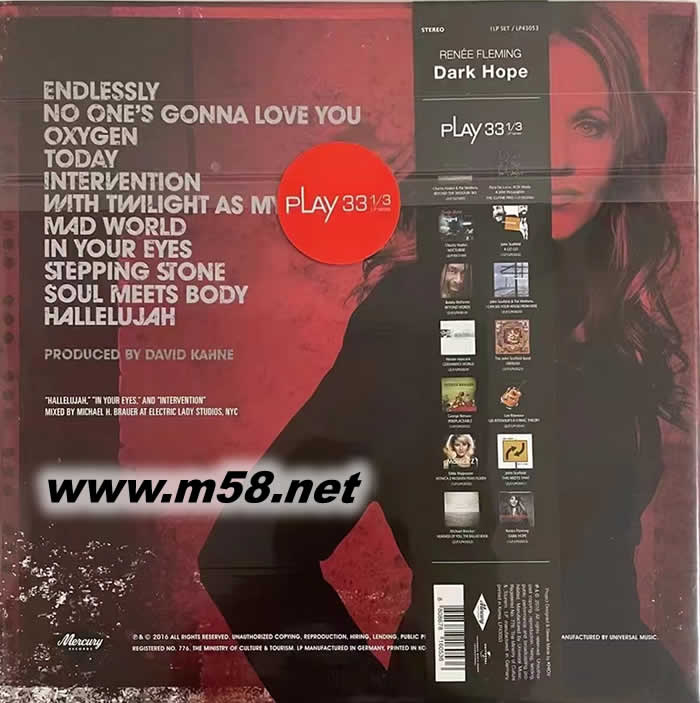 DARK HOPE 女高音 黑膠(m58.net) 蕾妮.弗萊明《DARK HOPE》 LP 現時最頂尖的抒情女高音的Renee Fleming,她的美聲和美貌令她成為各大歌劇院和音樂廳爭相邀請的歌劇唱家。而這張《Dark Hope》專輯,卻是演繹著她除了對歌劇之外的另一個愛好,用她特有的高音翻唱著著名流行歌曲。180克黑膠。