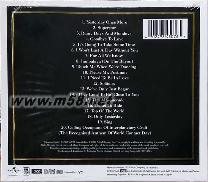 1、YESTERDAY ONCE MORE 2、SUPERSTAR 3、RAINY DAYS AND MONDAYS 4、GOODBYE TO LOVE 5、IT‘S GOING TO TAKE SOME TIME 6、I WON’T LAST A DAY WITHOUT YOU 7、FOR ALL WE KNOW 8、JAMBALAYA 9、TOUCH ME WHEN WE DANCING 10、LEASE MR POST MEN 11、I NEED TO BE IN LOVE 12、SOLITAILE 13、WE‘RE ONLY JUST REGUN 14、CLOSE TO YOU 15、THIS MASQUEARDE 16、TICKET TO RIDE 17、TOP OF THE WORLD 19、SING 20、CALLING OCCUPANTS OF INTERPLANETARY CRAFT (THE RECOGNISED ANTHEM OF WORLD CONTACT DAY)