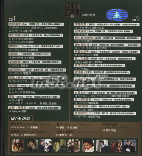 CD 1 浪漫滿屋《Rain、宋慧喬主演,最高收視與人氣韓劇》 01. 命運(Sha La La獨家女聲版) 02. 三只小熊 愛在哈佛《金來沅、金泰希主演,最IN校園偶像韓劇》 03. So In Love 沉醉愛河 04. 你身邊 權相宇《[Face Shop]化妝品,獨家電視廣告代言曲》 05. 在愛爾蘭 裴勇俊《[幸福會客室]形象廣告代言曲》 06. Too Young 年少輕狂 豪杰春香《韓彩英、在喜主演,逗趣溫馨另類韓劇》 07. 急診室 威尼斯戀人《韓彩英、趙顯宰主演,浪漫一夜情的美味韓劇》 08. 想愛你 菜鳥上班族《Eric、韓佳人主演,職場與情場甘苦的輕松韓劇》 09. 如果你走向我(愛的戀曲) 玻璃畫《李東健、金荷娜主演,最神秘美麗的愛情韓劇》 10. 朋友 11. 因你而存在 春日《趙寅成、池珍熙、高賢貞主演精致感人韓劇》 12. 春日 13. 那痛苦…那悲傷… 必勝!奉順英《安在旭、蔡琳主演愛情勵志韓劇》 14. Epilogue 終曲 CD 2 悲傷戀歌《權相宇、金喜善主演,掙扎于愛情、友情的悲情韓劇》 01. 常伴你左右 浪漫滿屋《Rain、宋慧喬主演,今夏最高收視與人氣韓劇》 02. 命運 對不起,我愛你《蘇志燮、林秀晶主演,網路討論超人氣話題韓劇》 03. 雪花 愛在陽光里《權相宇、明世彬主演,權相宇初試啼聲、一炮而紅韓劇》 04. 時光流逝 美麗的日子《崔智友、李秉憲主演,征服日本、東南亞人氣韓劇》 05. 重逢 愛上女主播《張東健、蔡琳、金素妍主演,韓劇唯美代表作》 06. You Can't Say(英文版) 愛情的條件《池城、韓佳人主演溫馨浪漫家庭劇》 07. 告白 玻璃鞋《金賢珠、蘇志燮主演,創超高收視率經典韓劇》 08. 我會守護你 小爸爸上學去《小天王Rain首部電視處女作,話題校園韓劇》 09. My Love 不良主婦《孫昌民、辛愛羅主演,以婚姻為題材的歡樂喜劇》 10. 時間 白雪公主《金晶華、李沅主演,丑小鴨變天鵝的愛情童話韓劇》 11. 無法自拔的愛你 皇太子的初戀《車太炫、成宥利主演,麻雀變鳳凰韓劇版》 12. 如果是我 天國的階梯《崔智友、權相宇主演超強催淚感人韓劇》 13. 想你 峇里島的日子《河智苑、趙仁成、蘇志燮主演另類話題韓劇》 14. 相約到來生