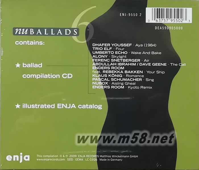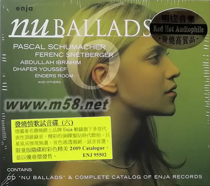 NU BALLADS 發燒情歌試音碟 六 /浪漫爵士夜魅力(m58.net) 爵士演奏營造氣氛的風格,網羅當代當紅爵士暨現代樂手的極致氛圍之作。若說Verve、Blue Note握有傳統爵士資產;則ENJA擁有媲美甚至超越前者那深具人類在爵士音樂承先啟后的爵士結晶 始於1996年,ENJA創辦人兼總裁Matthias Winckelmann親自選曲自家廠牌經典單曲集結發行首張BALLADS爵士精選。自此BALLADS系列全球銷售超過10萬張,對於一家堅持獨特品味的廠牌來說,是非常優秀的銷售成績。歷時13年焠鏈,第6集NU BALLADS所呈現的是現代乃至於未來的爵士發展,承襲即興精神與獨特氣象。爵士演奏營造氣氛的風格,網羅當代當紅爵士暨現代樂手的極致氛圍之作。若說Verve、Blue Note握有傳統爵士資產;則ENJA擁有媲美甚至超越前者那深具人類在爵士音樂承先啟后的爵士結晶。