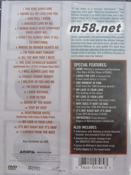- Home: Whitney's premiere performance [The Merv Griffin Show, 4/29/85] - Lover for Life: A Concert for a New South Africa" [11/12/94] - One Moment in Time: live from the 1989 Grammy awards - My Love Is Your Love: The Making of an Album" - My Love Is Your Love: live from Mannheim, Germany [1999] - Why Does It Hurt So Bad: live from the 1996 MTV Movie Awards - It's Not Right But It's Okay: from MTV All Access [7/9/99] - Impossible: From Disney's Rogers & Hammerstein's Cinderella - Interviews with Whitney and Arista Records founder and president Clive Davis - Behind-the-scenes footage from the "Greatest Hits" photo shoot - Lyrics to Whitney's best-loved songs 01. You Give Good Love 02. Saving All My Love for You 03. How Will I Know 04. Greatest Love of All 05. I Wanna Dance With Somebody (Who Loves Me) 06. Didn't We Almost Have It All 07. So Emotional 08. Where Do Broken Hearts Go 09. I'm Your Baby Tonight 10. All the Man That I Need 11. The Star Spangled Banner 12. I Will Always Love You 13. I'm Every Woman 14. I Have Nothing 15. Run to You 16. Queen of the Night 17. Step by Step 18. Heartbreak Hotel 19. My Love is Your Love 20. It's Not Right But It's Okay 21. I Learned From the Best