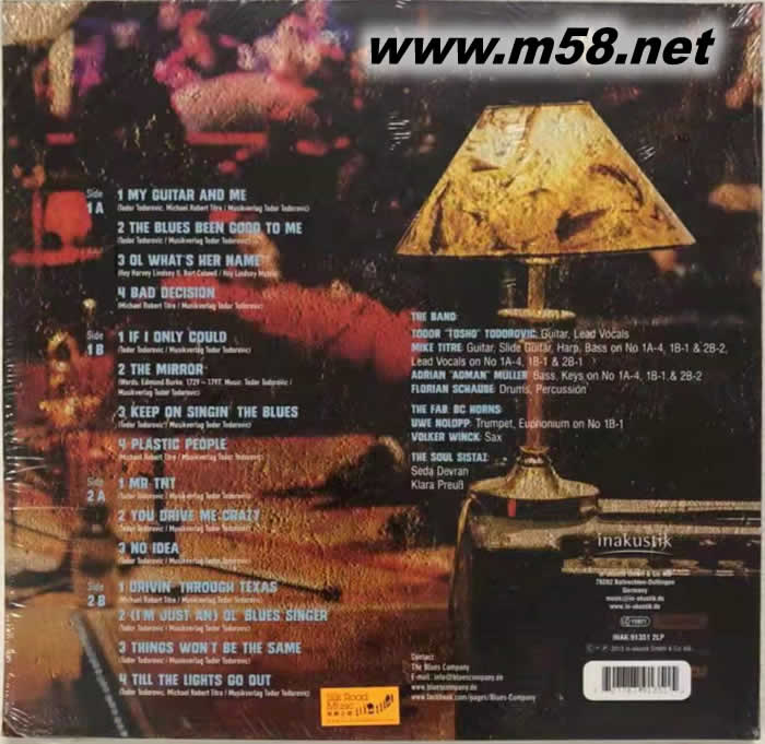 藍調公司BLUES COMPANY AIN T NOTHING BUT 雙黑膠(m58.net) Toscho Todorovic (結他及主唱) Mike Titre (結他及豎琴) Michael Müller (低音結他) Arnold Ogrodnik (低音結他及管風琴) Christian Rannenberg (鋼琴) Uwe Nolopp (小號) Franz „Scholli“ Knollmeyer (鼓) Florian Schaube (鼓) Volker Winck (中音薩克斯管 藍調公司樂隊曾獲得德國年度最佳節奏怨曲樂隊榮譽,是公認的藍調班霸,此專輯是“藍調公司”為2015年7月“莫斯塔爾國際藍調音樂節”的演出先為樂迷特別精心炮制的前奏演出,180G雙黑膠完全德國制造。