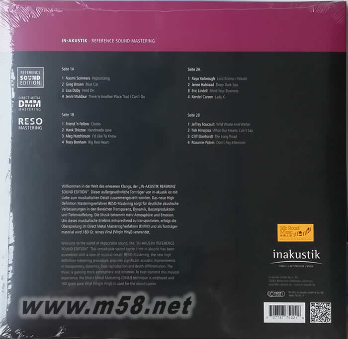 宏亮的嗓音-第2輯 Great Voices Vol.2 - Reference Sound Edition 180g 33RPM LP 黑膠 (INAKUSTIK宏亮系列)(m58.net) 音源對比母盤制作(RESO Mastering – Reference Sound Mastering)是採用現(xiàn)今最高解像度技術(shù)使原母盤內(nèi)的音源效果得以改良和提升,清澈度更高,動態(tài)范圍更寬,低頻更重更深,是音響發(fā)燒友夢寐以求的音效。這種新制式配合以1:1直刻母盤精製180克處女膠造成的黑膠盤為載體便成為完美無瑕的配合。【宏亮的嗓音,第2輯(Great Voices, Vol. II)】這專輯就是繼第1輯取得極度成功后再以這種高新技術(shù)制作,你可鑑賞到將每首歌的人聲和樂器聲更和暖和更具真實感,音色變得更晶瑩剔透,高音更清,中音更準,低音更重,音場更深更闊,動態(tài)更寬更廣,但又來得自然,加上各個唱者皆擁有一副動人的聲線,集合所有過人的優(yōu)點,每首樂曲便成為天籟之聲, 當你細聽【Naomi Sommers: Hypnotizing (內(nèi)奧米??索洛斯:催眠)】、【Greg Brown: Blue Car (格雷格??布朗:藍色汽車)】、【Lisa Doby: Hold On (麗莎??多比:堅持)】、【Jenni Muldaur: There Is Another Place That I Can’t Go (珍妮??穆多亞:有一處我不能到的地方)】、【Friend ‘n Fellow: Clocks (非凡樂隊:時鐘)】、【Hank Shizzoe: Handmade Love (漢克??席蘇爾:手造的愛)】、【Meg Hutchinson: I’d Like To Know (梅格??哈欽森:我想知道)】、【Tracy Bonham: Big Red Heart (特雷西??寶恆:大紅色的心)】、【Raya Yarbrough: Lord Knows I Would (拉雅??揚堡:主知道我會)】、【Jenee Halstead: Deep Dark See (珍妮??霍爾斯特德:深暗色見)】、【Eric Lindell: Mind Your Business (埃里克??林德爾:管你自己的事)】、【Carson: Lady K (卡森: K女仕)】、【Jeffrey Foucault: Wild Waste And Welter (杰弗里??福柯:野外廢物和韋爾特)】、【Tish Hinojosa: What Our Hearts Can’t Say (蒂殊??伊諾霍薩:我們的心所不能說的)】、【Cliff Eberhardt: The Long Road (克里夫??埃貝哈特:漫長的路)】及【Roxanne Potvin: Don’t Pay Attention (羅克珊??波特凡:不用注意)】等這些歌曲時,你便完全領略到這新制式確是音效完美之作,鑑聽必然之選。