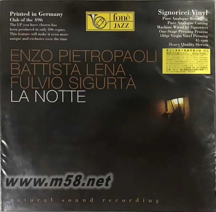 LA NOTTE 夜 爵士四重奏 Yatra 雙黑膠(m58.net) 恩佐‧皮埃特羅帕里爵士樂四重奏(Enzo Pietropaoli Quarter)是當今意大利最具實力和最受歡迎的爵士樂隊之一,其成員包括低音結他手恩佐‧皮埃特羅帕里(Enzo Pietropaoli),小號手弗維奧‧西古達(Fulvio Sigurta),琴鍵手朱利安‧馬斯薩里爾盧(Julian Mazzariello)及鼓手亞歷山德羅‧帕特尼斯(Alessandro Paternesi),他們都是首屈一指的著名樂手,他們以純熟的技術,合作無間地演奏多首創新作品包括【Il Mare Di Fronte(面向的海)】,【Smooth And Blue(平滑與蔚藍)】,【Pour Que L’Amour Me Quitte(如此愛你的眼睛)】,【Il Cuore e L’Azzurro(心與藍色)】,【Wise Up(聰明起來)】,【Wild Horses(野馬)】及【Elliptical Song(橢圓形之歌)】,CD版多錄【Onda Minore(微波蕩漾)】,【Tum Ko Dheka(圖姆‧科‧赫卡)】和【Quella Cosa In Lombardia(奎拉在倫巴第發生的事情)】,配以最新、最先進的錄音器材和技術,傳真地收錄這些精彩歌曲,加上后期處理由著名錄音師里玆(Giulio Cesare Ricci)操刀處理, 全球限量496張的24K金CD為載體,聲效更為顯著, 帶來更完美更真實的發燒爵士樂鑑聽盤。