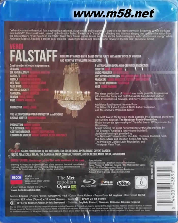 JAMES LEVINE指揮 FALSTAFF 威爾第:法斯塔夫 藍光BD(m58.net) 三幕喜歌劇《法斯塔夫》,是威爾第在80歲時創作,1893年2月9日首演於米蘭。故事發生於十四世紀,英國國王亨利四世統治時期,英格蘭中部的溫莎地方。法斯塔夫同時向福德的夫人艾麗絲和佩奇的太太瑪格麗特遞送相同的情書。艾麗絲、瑪格麗特、醫生卡尤斯與芬頓,以及法斯塔夫的侍從巴多夫與皮斯托都非常厭惡法斯塔夫的這種行為。於是他們聯合起來設下圈套,假意與法斯塔夫約會,三番兩次的愚弄他,使得法斯塔夫自食惡果,狼狽不堪。德國歌劇作曲家、指揮家尼可萊的喜歌劇作品《溫莎地方的快樂妻子》也是根據這段故事作成的。 一向以寫作嚴肅歌劇著稱的威爾第,一生只寫過兩部喜歌劇,其一是他年輕時在米蘭受歌劇院委託而做的《一日之王》,其二則是晚年所寫的《法斯塔夫》。1893年他推出了第二部高齡之作:抒情喜劇《法斯塔夫》,帶給大眾的驚訝超過了六年前的《奧泰羅》;這兩部作品皆以莎士比亞之戲劇作品為素材,由包益多(Arrigo Boito, 1842-1918)寫成歌劇劇本。 威爾第是義大利歌劇界最重要的作曲家,比起前輩,他將歌劇劇本與音樂創作融合得更為緊密,因而能夠與華格納的歌劇作品抗衡。成熟時期所創作的歌劇受到華格納的影響,出現琢磨更深的佳作,也是義大利歌劇的高峰,例如《阿依達》、《奧泰羅》、《法斯塔夫》等都是。其歌劇除了一氣呵成的優美音樂之外,在劇情上也有所突破,並以新的手法刻畫劇中人物,進入角色的內心,與筆下的人物同甘共苦。這個特質與莎士比亞很像,因此像《馬克白》、《奧泰羅》、《法斯塔夫》等劇,都有著極高的藝術評價。 本錄影為紐約大都會歌劇院五十年來的首度演出製作,由現任音樂總監李汶指揮,這也是他重返大都會歌劇院舞臺后的首次全新製作。紐約時報表示:「說到劇場的氛圍、裝扮的迷人、滑稽的動作與布景的創意,百老匯的許多演出都不及大都會歌劇院全新製作的《法斯塔夫》」。由卡爾森所導演的這場視覺盛宴更具有「深思熟慮、感染力十足與爆笑的舞臺效果。其時代則由亨利四世,來到了50年代的英格蘭」。金融時報則表示李汶的指揮具備:「深情的能量」,領銜主唱法斯塔夫一角的安伯喬(Ambrogio Maestri)「博得滿堂喝采,並展現罕見的男中音之熾熱演出」。