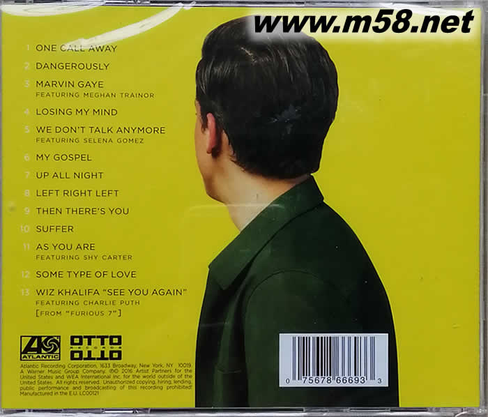 1. ONE CALL AWAY 愛在咫尺 向遠距離的朋友表達關懷的清新小品,已締造YouTube超過2220萬點擊瀏覽率 2. DANGEROUSLY 危險愛情 3. MARVIN GAYE FEATURING MEGHAN TRAINOR 馬文蓋 與棉花糖女孩-梅根崔娜男女對唱,撩人煽情歌詞加上討喜旋律,成功締造英國金榜冠軍&全美百萬白金銷售紀錄 4. LOSING MY MIND失去理智 5. WE DON’T TALK ANYMORE FEATURING SELENA GOMEZ 不再甜蜜 邀請新世代天后-席琳娜獻聲助陣,以木吉他與電子節拍交織出性感舞動的曲式、詮釋出分手切斷聯繫后還掛念對方的復雜心情 6. MY GOSPEL 愛的準則 7. UP ALL NIGHT 徹夜未眠 8. LEFT RIGHT LEFT 向左走 向右走 9. THEN THERE’S YOU 然后是妳 10. SUFFER 折磨 11. AS YOU ARE FEATURING SHY CARTER 這樣的妳[害羞卡特 獻聲助陣] 12. SOME TYPE OF LOVE 特別的愛 13. WIZ KHALIFA “SEE YOU AGAIN” FEATURING CHARLIE PUTH 當我們再相見 紀念已逝影星保羅沃克,與繞舌天王-威茲哈利法合作,12週蟬聯全美流行榜冠軍、拿下全球100多國排行#1的【玩命關頭7】電影主題曲
