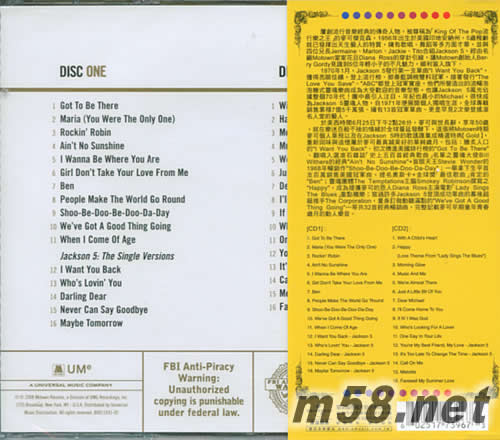CD 1 01. GOT TO BE THERE 02. MARIA (YOU WERE THE ONLY ONE) 03. ROCKIN ROBIN 04. AIN'T NO SUNSHINE 05. I WANNA BE WHERE YOU ARE 06. GIRL DON'T TAKE YOUR LOVE GROM ME 07. BEN 08. PEOPLE MAKE THE WORLD GO ROUND 09. SHOO-BE-DOO-BE-DOO-DA-DAY 10. WE'VE GOT A GOOD THING GOING 11. WHEN I COME OF AGE JACKSON 5:THE SINGLE VERSIONS 12. I WANT YOU BACK 13. WHO'S LOVIN YOU 14. DARLING DEAR 15. NEVER CAN SAY GOODBYE 16. MAYBE TOMORROW CD 2 01. WITH A CHILD'S HEART 02. HAPPY(LOVE THEME FROM"LADY SINGS THE BLUES") 03. MOMING GLOW 04. MUSIC AND ME 05. WE'RE ALMOST THERE 06. JUST A LITTLE BIT OF YOU 07. DEAR MICHAEL 08. I'LL COME HOME TO YOU 09. IF N'I WAS GOD 10. WHO'S LOOKING FOR A LOVER 11. ONE DAY IN YOUR LIFE 12. YOU'RE MY BEST FRIEND MY LOVE-JACKSON 5 13. IT'S TOO LATE TO CHANGE THE TIME-JACKSON 5 14. CALL ON ME 15. MELODIE 16. FAREWELL MY SUMMER LOVE