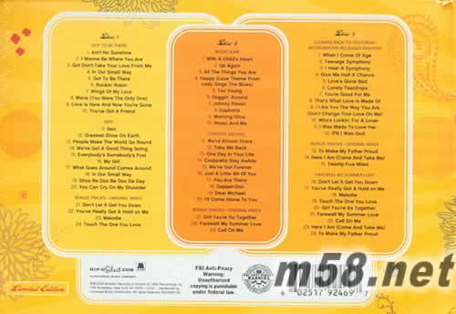 CD 1 01. Ain't No Sunshine 02. I Wanna Be Where You Are 03. Girl Don't Take Your Love From Me 04. In Our Small Way 05. Got To Be There 06. Rockin' Robin 07. Wings of My Love 08. Maria 09. Love Is Here and Now You're Gone 10. You've Got a Friend 11. Ben 12. Greatest Show On Earth 13. People Make the World Go 'Round 14. We've Got a Good Thing Going 15. Everybody's Somebody's Fool 16. My Girl 17. What Goes Around Comes Around 18. In Our Small Way 19. Shoo-Be-Doo-Be-Doo-Da-Day 20. You Can Cry On My Shoulder 21. Don't Let It Get You Down 22. You've Really Got a Hold On Me 23. Melodie 24. Touch the One You Love CD 2 01. With a Child's Heart 02. Up Again 03. All the Things You Are 04. Happy 05. Too Young 06. Doggin' Around 07. Euphoria 08. Morning Glow 09. Johnny Raven 10. Music and Me 11. We're Almost There 12. Take Me Back 13. One Day In Your Life 14. Cinderella Stay Awhile 15. We've Got Forever 16. Just a Little Bit of You 17. You Are There 18. Dapper Dan 19. Dear Michael 20. I'll Come Home To You 21. Girl You're So Together 22. Farewell My Summer Love 23. Call On Me CD 3 01. When I Come of Age 02. Teenage Symphony 03. I Hear a Symphony 04. Give Me Half a Chance 05. Love's Gone Bad 06. Lonely Teardrops 07. You're Good For Me 08. That's What Love Is Made of 09. I Like You the Way You Are 10. Who's Looking For a Lover 11. I Was Made To Love Her 12. If N' I Was God 13. To Make My Father Proud 14. Here I Am 15. Twenty Five Miles 16. Don't Let It Get You Down 17. You've Really Got a Hold On Me 18. Melodie 19. Touch the One You Love 20. Girl You're So Together 21. Farewell My Summer Love 22. Call On Me 23. Here I Am 24. To Make My Father Proud