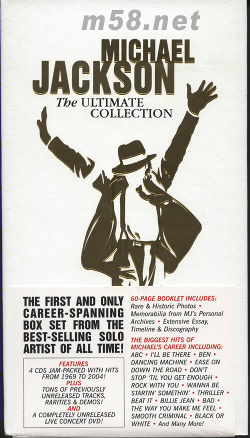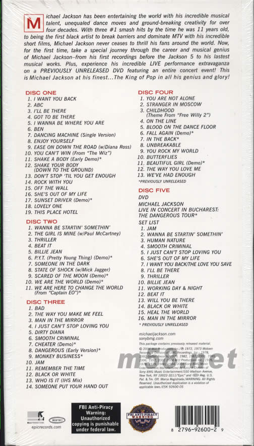 DISC ONE 01. I WANT YOU BACK 02. ABC 03. I'LL BE THERE 04. GOT TO BE THERE 05. I WANNA BE WHERE YOU ARE 06. BEN 07. DANCING MACHINE(Single Version) 08. ENJOY YOURSELF 09. EASE ON DOWN THE ROAD(w/Diana Ross) 10. YOU CAN'T WIN(From"The Wiz") 11. SHAKE A BODY(Early Demo)* 12. SHAKE YOUR BODY(DOWN TO THE GROUND) 13. DON'T STOP TIL YOU GET ENOUGH 14. ROCK WITH YOU 15. OFF THE WALL 16. SHE'S OUT OF MY LIFE 17. SUNSET DRIVER(Demo)* 18. LOVELY ONE 19. THIS PLACE HOTEL DISC TWO 01. WANNA BE STARTIN'SOMETHIN' 02. THE GIRL IS MINE(w/Paul McCartney) 03. THRILLER 04. BEAT IT 05. BILLIE JEAN 06. P.Y.T.(Pretty Young Thing)(Demo)* 07. SOMEONE IN THE DARK 08. STATE OF SHOCK(w/Mick Jagger) 09. SCARED OF THE MOON(Demo)* 10. WE ARE THE WORLD(Demo)* 11. WE ARE HERE TO CHANGE THE WORLD(From"Captain EO")* DISC THREE 01. BAD 02. THE WAY YOU MAKE ME FEEL 03. MAN IN THE MIRROR 04. I JUST CAN'T STOP LOVING YOU 05. DIRTY DIANA 06. SMOOTH CRIMINAL 07. CHEATER(Demo)* 08. DANGEROUS(Early Version)* 09. MONKEY BUSINESS* 10. JAM 11. REMEMBER THE TIME 12. BLACK OR WHITE 13. WHO IS IT(IHS Mix) 14. SOMEONE PUT YOUR HAND OUT DISC FOUR 01. YOU ARE NOT ALONE 02. STRANGER IN MOSCOW 03. CHILDHOOD(Theme From"Free Willy 2") 04. ON THE LINE 05. BLOOD ON THE DANCE FLOOR 06. FALL AGAIN(Demo)* 07. IN THE BACK* 08. UNBREAKABLE 09. YOU ROCK MY WORLD 10. BUTTERFLIES 11. BEAUTIFUL GIRL(Demo)* 12. THE WAY YOU LIVE ME 13. WE'VE HAD ENOUGH *PREVIOUSLY UNRELEASED DISC FIVE DVD MICHAEL JACKSON LIVE IN CONCERT IN BUCHAREST: THE DANGEROUS TOUR* SET LIST 01. JAM 02. WANNA BE STARTIN'SOMETHIN' 03. HUMAN NATURE 04. SMOOTH CRIMINAL 05. I JUST CAN'T STOP LOVING YOU 06. SHE'S OUT OF MY LIFE 07. I WANT YOU BACK/THE LOVE YOU SAVE 08. I'LL BE THERE 09. THRILLER 10. BILLIE JEAN 11. WORKING DAY & NIGHT 12. BEAT IT 13. WILL YOU BE THERE 14. BLACK OR WHITE 15. HEAL THE WORLD 16. MAN IN THE MIRROR *PREVIOUSLY UNRELEASED