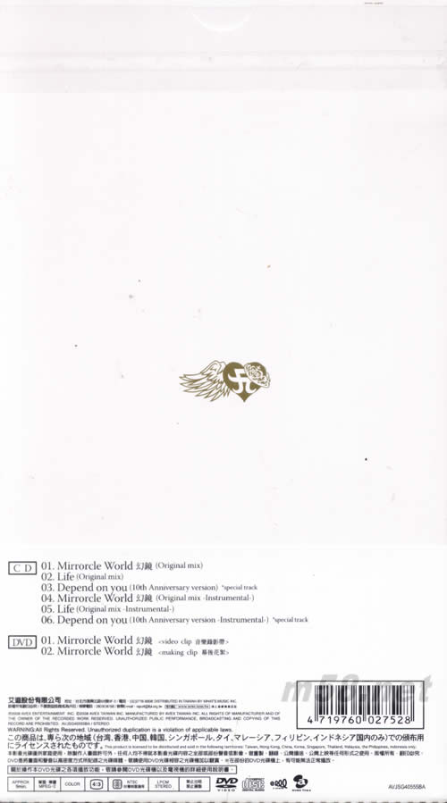 CD 01. Mirrorcle World (Original mix) 02. Life(Original mix) 03. Depend on you(10th Anniversary version)special track 04. Mirrorcle World (Original mix-Instrumental) 05. Life(Original mix-Instrumental) 06. Depend on you(10th Anniversary version-Instrumental)special track DVD 01. Mirrorcle World (video clip) 02. Mirrorcle World (making clip)