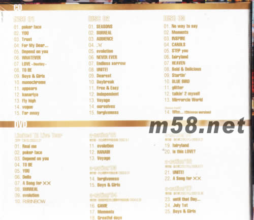 DISC 1 01.poker face 02.YOU 03.Trust 04.For My Dear... 05.Depend on you 06.WHATEVER 07.LOVE ~Destiny~ 08.TO BE 09.Boys & Girls 10.monochrome 11.appears 12.kanariya 13.Fly high 14.vogue 15.Far away DISC 2 01.SEASONS 02.SURREAL 03.AUDIENCE 04.M 05.evolution 06.NEVER EVER 07.Endless sorrow 08.UNITE! 09.Dearest 10.Daybreak 11.Free & Easy 12.independent 13.Voyage 14.ourselves 15.forgiveness DISC 3 01.No way to say 02.Moments 03.INSPIRE 04.CAROLS 05.STEP you 06.fairyland 07.HEAVEN 08.Bold & Delicious 09.Startin' 10.BLUE BIRD 11.glitter 12.talkin' 2 myself 13.Mirrorcle World Bonus Track 14.Who... (Chinese Version)