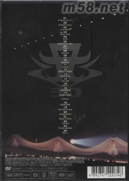 01. A Song for XX 02. Greatful days 03. evolution 04. poker face 05. Trust 06. Depend on you 07. you 08. Dearest 09. M 10. appears 11. vogue 12. NEVER EVER 13. SURREAL 14. Fly high 15. UNITE! 16. AUDIENCE 17. forgiveness 18. SEASONS 19. No way to say 20. independent 21. Boys & Girls 22. Trauma 23. flower garden 24. Who.... 內(nèi)附中譯歌詞