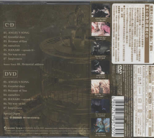 CD 01. ANGEL S SONG 02. Greatful days 03. Because of you 04. ourselves 05. HANABI -episode Ⅱ- 06. No way to say 07. forgiveness Bonus Track 08. Memorial address DVD 01. ANGEL S SONG 02. Greatful days 03. Because of You 04. ourselves 05. HANABI -episode Ⅱ- 06. No way to say 07. forgiveness Special Digest