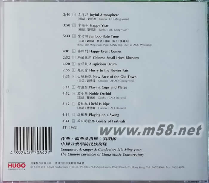 1.喜洋洋JOYFUL ATMOSPHERE 2.幸福年 HAPPY YEAR 3.紫竹調BAMBOO-FIUTE TUNE 4.喜臨門HAPPY EVENT COMES 5.馬蘭花開CHINESE SMALL LRISES BLOSSOM 6.吉祥鼓AUSPICIOUS DRUM 7.趕花會HURRY TO THE FLOWER FAIR 8.古城新貌NEW FACE OF THE OLD TOWN 9.打盅盤PLAYING CUPS AND PLATES 10.君子蘭NOBLE ORCHID 11.荔枝紅LITCHI IS RIPE 12.蕩秋千PLAYING ON A SWING 13.節日的歡樂CAIETY OF RESTIVALS
