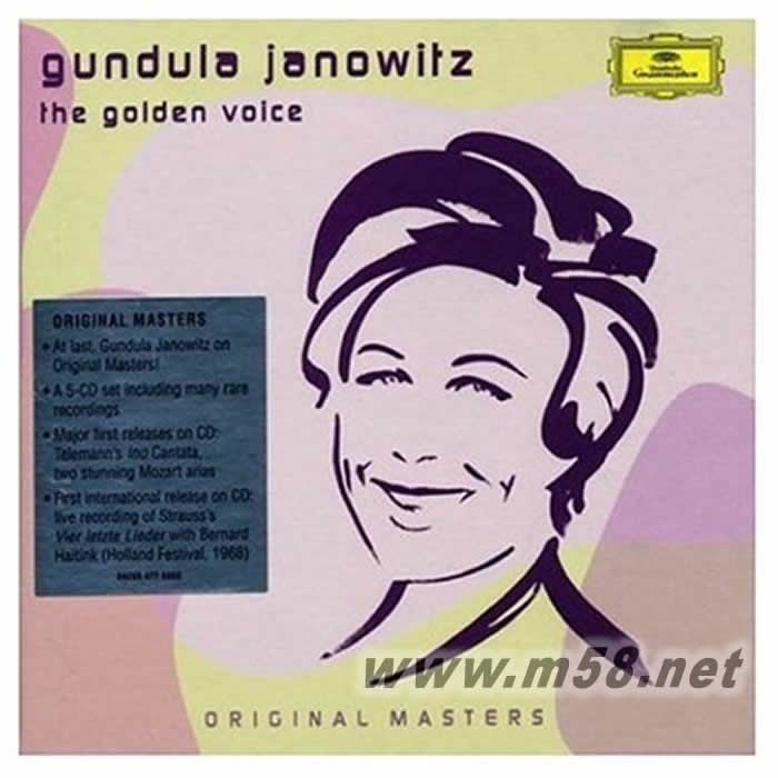 價格為估,以實到貨為準! Golden Voice 黃金之聲 盒裝五CD(m58.net) 這款《黃金之聲》由DG唱片公司發行于2006年,內收錄了德國女高音昆杜拉•雅諾維茨演唱生涯的一些珍貴錄音。 這可以說是一套久違的雅諾維茨個人專輯,除了雅諾維茨個人頗受好評的歌劇詠嘆調(特別是莫札特的作品)與音樂會曲目,還有首度以CD型式發行的泰勒曼清唱劇。值得一提的是,理查•史特勞斯《四首最后的歌》是雅諾維茨于1968年與海汀克及阿姆斯特丹大會堂管弦樂團在荷蘭音樂節上的實況錄音,過去只在荷蘭發行過,而這個版本一般認為比雅諾維茨與卡拉揚的版本更杰出。 “Original Masters”大師原版系列,都是以最簡單的包裝、最實惠的價格,將大師原版一次性打包推出的多碟套裝系列。大師原版系列收錄的都是當年經典錄音的原版母帶,所以相當珍貴。此系列作為特價套裝,除了包裝比較簡單節省外,唱片全部與普通版一樣,同樣是德國壓片,品質相當好。 德國女高音昆杜拉•雅諾維茨(Gundula Janowitz)于1937年生于德國柏林,在格拉茨接受音樂教育,1959年首次在維也納國立歌劇院演唱莫札特《費加洛婚禮》,后在維也納國立歌劇院演唱長達30年,特別擅長莫札特與理查•史特勞斯的作品,1960年到1962年在拜魯特音樂節演出華格納《帕西法爾》,1968年首度在薩爾茲堡音樂節上演唱莫札特《唐喬望尼》,后固定在紐約大都會歌劇院、英國柯芬園等著名歌劇院演出。除了歌劇,雅諾維茨也擅長演出藝術歌曲。