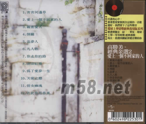 高勝美經典金選2 愛上一個不回家的人 [留聲經典復刻版](m58.net) 任誰的心中,都會想要緊緊抓信這樣的一首歌 還好,我們留下了這些聲音 環球上華留聲經典復刻版系列 精選寶麗金\綜一\華星\環球\上華...等等時期經典專輯
