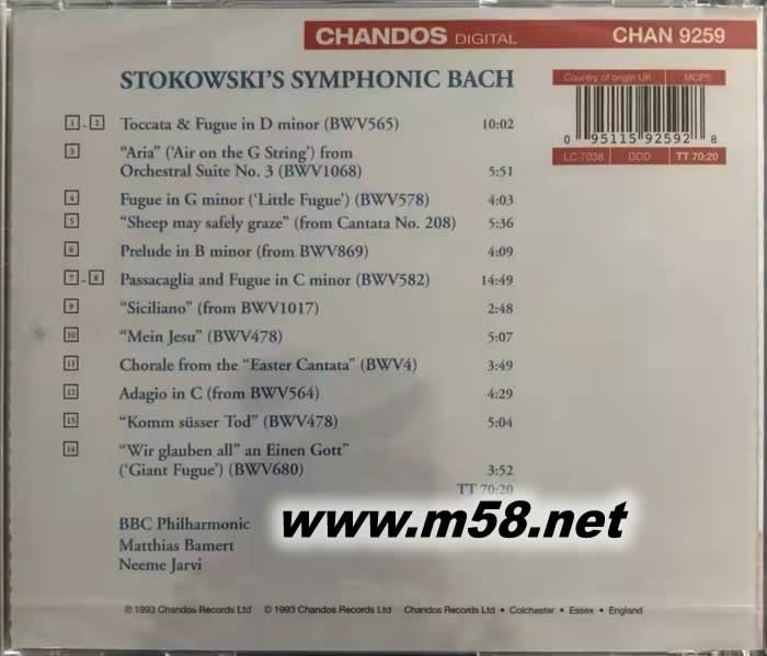 《斯托克夫斯基改編的巴赫作品》包括:托卡塔與賦格、G弦上的詠嘆調、小賦格、著名康塔塔”羊群安然吃草”、清唱劇選:來吧,甜蜜的死亡,柔板等,巴墨特指揮,BBC愛樂樂團,企鵝三星名盤