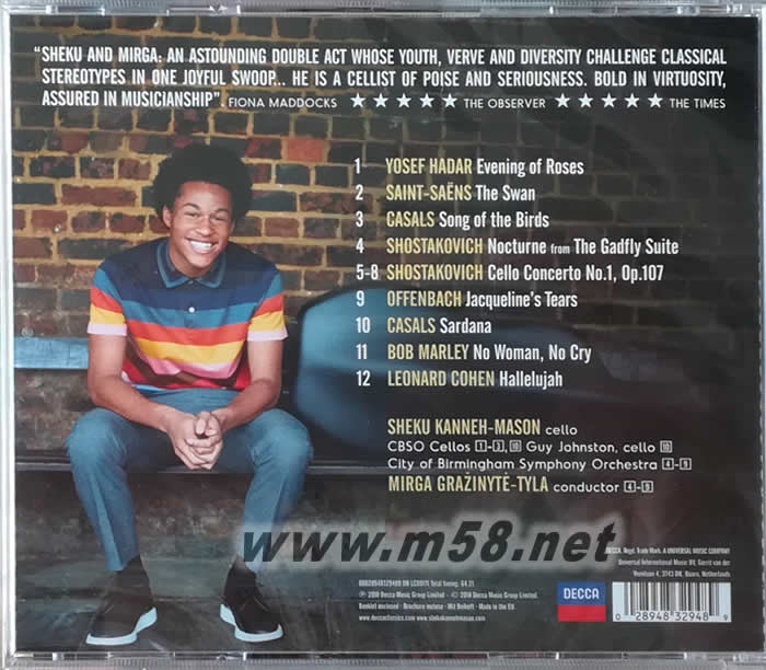Inspiration 19歲大提琴手(m58.net) 年僅19歲年青大提琴手Sheku Kanneh-Mason, 剛為哈里王子大婚作表演嘉賓, 全球十多億人觀看! 個(gè)人最新大碟”Inspiration” 除收錄Shostakovich, Offenbach及Saint-Saëns等作品外, 更跨界演繹Bob Marley – “No Woman, No Cry” 及Leonard Cohen – “Hallelujah”.