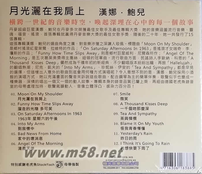 漢娜.鮑兒:月光灑在我肩上 Hanne Boel: Moon On My Shoulder(m58.net) 橫跨一世紀的音樂時空,喚起深埋在心中的每一個故事 丹麥超級巨星漢娜.鮑兒在丹麥多次榮獲最佳女歌手及最佳專輯大獎,她的音樂涵蓋流行音樂、靈魂、福音、搖滾,首張專輯就贏得丹麥音樂大獎的最佳女歌手獎,隨后的二十年,她一共發行了15張專輯。 這張專輯漢娜.鮑兒的選曲角度之廣、對音樂涉獵之深讓人敬佩。標題曲「Moon On My Shoulder」是鄉村搖滾紅星萊爾.拉維特的作品;「On Saturday Afternoons In 1963」是搖滾才女瑞奇.李.瓊斯的作品;「Funny How Time Slips Away」則是鄉村巨星威利.尼爾森所作;「Angel Of The Morning」是五次葛萊美獎得主喬絲.紐頓的冠軍曲。流行歌曲方面,民謠詩人李歐納.科恩的「A Thousand Kisses Deep」儼然成為千禧年初的新經典,不少翻唱版本紛紛出籠,再掀「Hallelujah」的翻唱熱潮;尼克.凱夫的「Into My Arms」、珍妮絲.伊安的「Tea And Sympathy」都是罕見的選擇。但這樣出人意外的歌曲到底會用何種方式演唱呢?令人意想不到的是,漢娜.鮑兒採用小酒館的演唱方式,她以充滿畫面的聲音來訴說這些歌曲。配合鋼琴為主的簡單伴奏,歌聲似乎也變成一種樂器,深情的唱出一個又一個的動人故事。專輯本身的錄音品質已屬上乘,再經由德國老虎魚錄音室的母帶處理加持,歌聲氣韻動人、音像立體浮凸,感染力百分百!