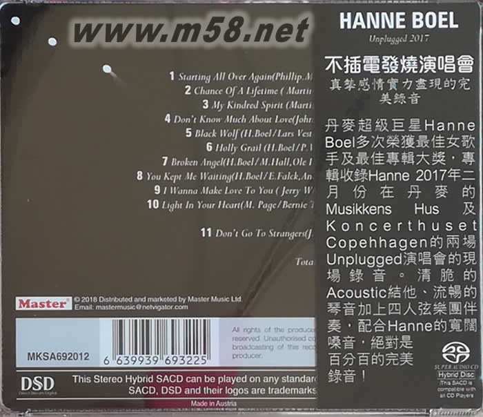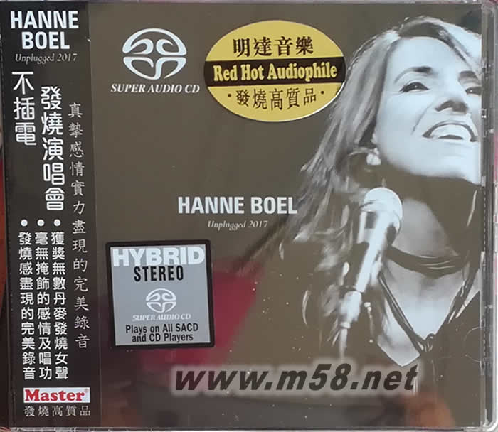 Unplugged 2017 不插電發燒演唱會 (丹麥發燒女聲)SACD(m58.net) 獲獎無數丹麥發燒女聲最完美錄音 丹麥超級巨星漢娜.鮑兒( Hanne Boel)多次榮獲最佳女歌手及最佳專輯大獎,她的音樂涵蓋流行音樂、靈魂、福音、搖滾,新專輯收錄Hanne 2017年二月份在丹麥的Musikkens Hus及Koncerthuset Copehhagen的兩場Unplugged演唱會的現場錄音,現在推出SACD版本。清脆的Acoustic吉他、流暢的琴音加上四人弦樂團伴奏,配合Hanne的寬闊嗓音,絕對是百分百的完美錄音!原裝歐洲版,試音首選!