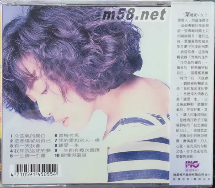 葉璦菱點歌集10(m58.net) [葉璦菱V.S.十個男人]的最后杰作。這張專輯的推出與前一張專輯時間上只相隔兩個月,發行之后,葉愛菱也與瑞星唱片畫下完美的句號,展翅高飛。這張專輯收錄了齊秦的佳作[冷空氣的獨白],陳升的[把悲傷留給自己],張瓊瑤風靡一時的[有天我會],劉德華的暢金曲[我和我追逐的夢],杜德偉的情歌名曲[鐘愛一生],以及陳淑樺的[傲慢與偏見]等等好歌。其中,讓人印像最深刻的,是好與民歌手王瑞瑜對唱的[把悲傷留給自己],深情款款,,與歌曲中的無奈感傷,淋漓盡致,扣人心弦。在完美的句點之后,留下是永恒的掌聲與感動。