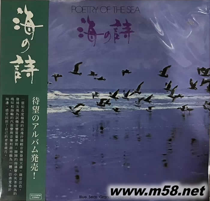 海之詩 Poetry of the Sea 黑膠(m58.net) 一張知名度極高的浪漫抒情輕音樂發燒天碟 日本 JVC 制作,音色飽滿,立體聲強,發燒友視為試機音響準則。 陣陣的海濤聲中夾著海鳥中的鳴叫和海輪的汽笛聲與音樂和諧地融為一體, 讓你彷彿置身于海邊。感受回到了自己的青蔥歲月。 音響技術 執行主編 --大草 : 「好音響必備的靚音樂。陪伴我在音響路上成長,百聽不厭的輕音樂 "海之詩" 大碟,終于重現江湖! 」