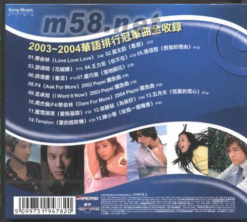 1、蔡依林(LOVE LOVE LOVE) 2、莫文蔚(看透) 3、游鴻明(花蝴蝶) 4、王力宏(你不在) 5、張信哲(想我的理由) 6、庚澄慶(春泥) 7、盧巧音(落地開(kāi)花) 8、F4(ASK FOR MORE)2002PEPSI廣告曲 9、言承旭(I WANT NOW)2003 PEPSI廣告曲 10、周杰倫/F4/蔡依林/(DARE FOR MORE)2004PEPSI廣告曲 11、蜜雪薇琪(愛(ài)斯基摩) 12、梁靜茹(為我好) 13、王月天(恒星的恒心) 14、TENSION(愛(ài)的提款機(jī)) 15、陳小春(給我一個(gè)機(jī)會(huì))