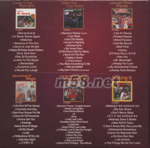 CD 1 01. Sha-la-la-la-la 02. I'll Never Dance Again 03. Waterloo 04. Seasons In The Sun 05. Jesus Is Just Alright 06. Happy Birthday Sweet Sixteen 07. Over And Over 08. Ray Of Sunshine 09. Listen To The Music 10. Remember 11. Sunshine Lover 12. Would You Laugh CD 2 01. Wynner's Theme(English) 02. Lion Rock 03. Face The Reality 04. Kung Fu Fighting 05. Dearest Irene 06. My Home Town 07. (I Did What I Did)For Maria 08. Band On The Run 09. Daddy's Home 10. China Grove11. You Mean Everything To Me 12. Mrs Vandelbilt 13. Wynner's Theme(cantonese) CD 3 01. I Go To Pieces 02. Pinball Wizard 03. Wind Flowers 04. Call Me Round 05. Bad Time 06. Gypsy 07. (I'll Give You)L-O-V-E 08. Hey You 09. Mr.Moonlight 10. Ready For Love 11. My Sentimental Friend 12. Honky Tonk Woman CD 4 01. 4:55(Part Of The Game) 02. Concrete And Clay 03. Save Your Kisses For Me 04. Carry ON Till Tomorrow 05. Gonna Get You 06. Feelings 07. Same Kind Of Magic 08. All By Myself 09. Lady 10. Reflections Of My Life 11. Saturday Night 12. 改邪歸正歌 CD 5 01. Wynners' Theme-English Version 02. Sweet Loving Man 03. Una Paloma Blanca 04. If 05. Evie 06. Lady Lady Lady 07. Goodbye Yellow Brick Road 08. Celebrate 09. Rock N'Roll Love Letter 10. I'd Really Love To See You Tonight 11. Street Singin' 12. Never My Love 13. Junioo's Farm 14. Silly Love Songs 15. Same Kind Of Magic-Soundtrack CD 6 01. Making It 電影“追趕跑跳碰”插曲 02. My Fair Share 03. Don't Worry Baby 04. 耍花招 電影“追趕跑跳碰”插曲 05. Nobody Does It Better 06. New Kid In Town 07. I Don't Know Why You Love Me 08. Hollywood Symphony 09. Carry On Wayward Son 10. Da Doo Ron Ron 11. Jet Airliner 12. The Things We Do For Love