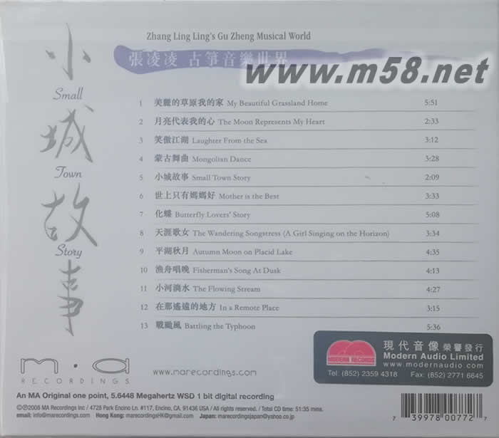張凌凌[ 小城故事] 古箏音樂世界(m58.net) 美國獨立唱片廠牌MA Recordings老兼錄音怪杰Todd Garfinkle攜他的獨門錄音名器專程來港操刀錄音。對教堂錄音情有獨鍾的Todd Garfinkle,於西貢一所教堂,以原單點直刻錄音技術(shù),把悅耳之堂音,自然理想之殘響,巧手稍加擺弄,成就這一張空前靚聲的中樂天碟。 少數(shù)能夠自彈自唱的古箏演奏家。首張專輯獻(xiàn)給 M.A Recordings,自然純凈的錄音展現(xiàn)驚人的音樂實力! ★ 位於香港西貢濱海小教堂錄音,以搭載丹麥?zhǔn)耙纛^的麥克風(fēng)單點錄音,人聲、演奏與空間殘響達(dá)到完美平衡! 張凌凌是少數(shù)能夠自彈自唱的古箏演奏家。自廈門大學(xué)畢業(yè)的她,現(xiàn)在在香港積極從事教學(xué)與演奏的工作。張凌凌將她首張個人專輯,獻(xiàn)給了以單點錄音聞名的 M.A Recordings,透過製作人兼錄音師陶德葛芬柯優(yōu)異的錄音技術(shù),帶來純凈而且自然不造作的音樂體驗。 透過張凌凌動人演奏與演唱,〈小城故事〉、〈月亮代表我的心〉更顯柔美動人,而〈平湖秋月〉、〈漁舟唱晚〉等古曲演奏,更展現(xiàn)張凌凌深厚的演奏實力。片尾更由張凌凌的老師、現(xiàn)為香港中樂團(tuán)古箏首席羅晶演奏〈戰(zhàn)颱風(fēng)〉,以古箏各種技法描述漁民與颱風(fēng)搏斗的景象。本片位於香港西貢教堂錄音,堂音華美,不可錯過!
