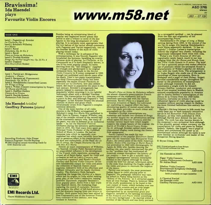 韓黛爾小提琴藝術(2) ~安可曲(返場曲)篇 BRAVISSIMA! FAVOURITE VIOLIN ENCORES) 黑膠(m58.net) 小提琴女杰傳奇名盤,精彩演繹多首動聽返場小品;包括: 帕格尼尼<鐘>/ 塔替尼/ 薩拉沙特 / 舒伯特<圣母頌>/ 孟德爾頌/ 拉威爾/ 德弗札克<媽媽教我的歌>/ 巴爾托克<羅馬尼亞舞曲>…. 12首傳世經典 EMI原廠立體聲音源,英國原裝進口 韓黛爾小提琴藝術(1) ~ 巴洛克篇(ASD3352)同步上市
